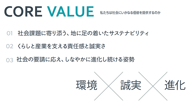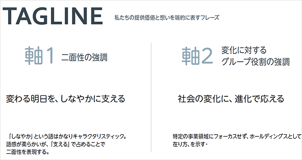 分析を統合して見えてきたこの企業の本質——動的(変化・進化)でありながら静的(安定・供給)でもある「しなやかなアンビバレンス」。ここから3つのコアバリューを策定し、タグライン「変わる明日を、しなやかに支える」を導出。"柔らかいが強い"というトーン設計が鍵でした。