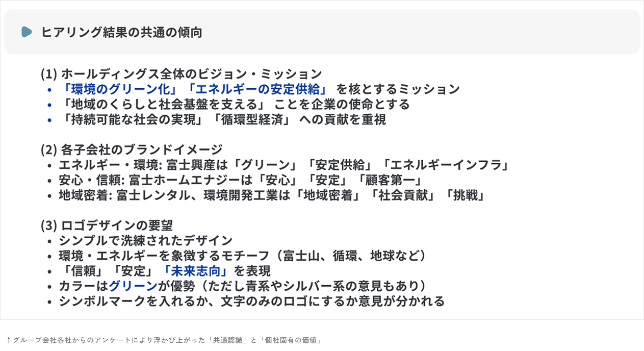 加えて、グループ4事業会社(富士興産・環境開発工業・富士レンタル・富士ホームエナジー(※当時))はそれぞれ異なる事業領域で強みを持ち、独自のブランドイメージを持っていました。「統一感」と「各社の独自性」を両立させながら、ホールディングスとしての求心力を言語化し、可視化することが求められました。