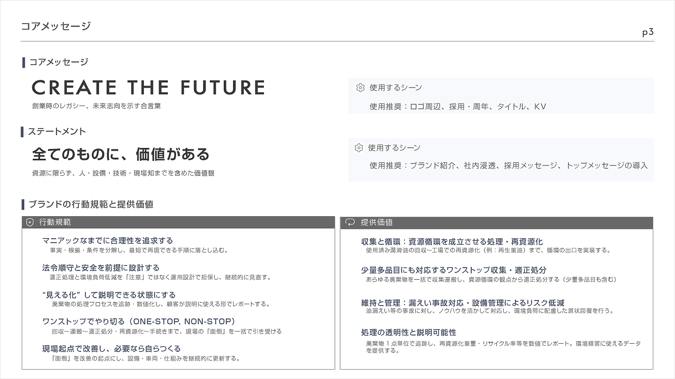 事業領域・サービス構造・組織の意思決定パターンに加え、同社が自ら発信してきたコラムやWebコンテンツを読み解きました。法令・安全・コスト・納期の充足、プロセスの数値化と説明可能性、ワンストップの実行力——これらを行動規範として構造化し、ブランドナラティブとコアメッセージに集約しています。