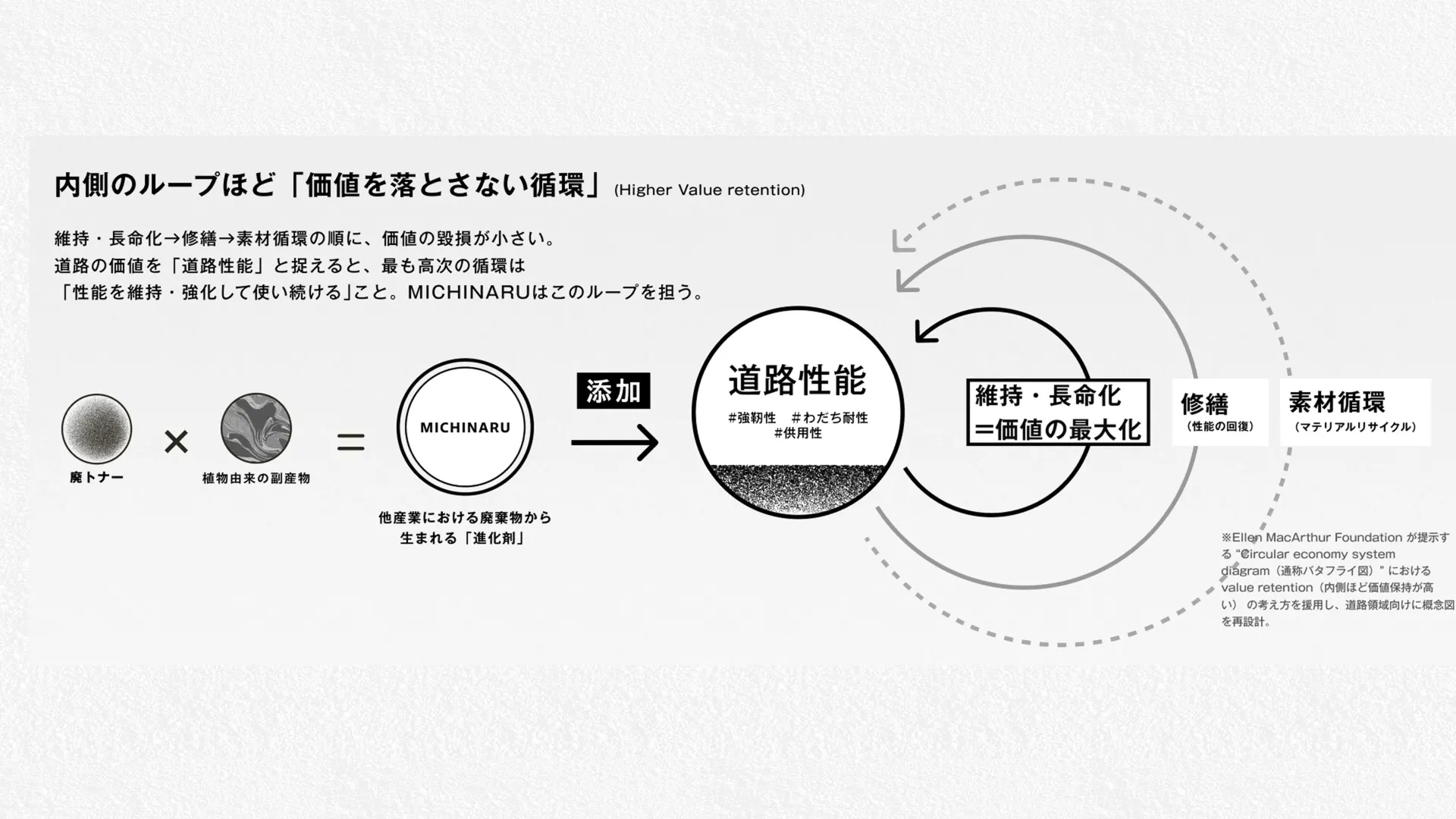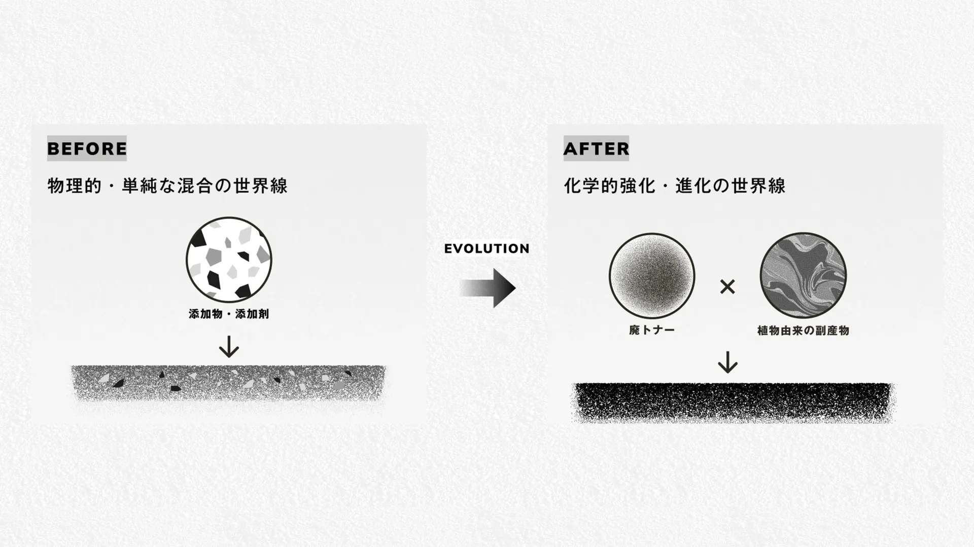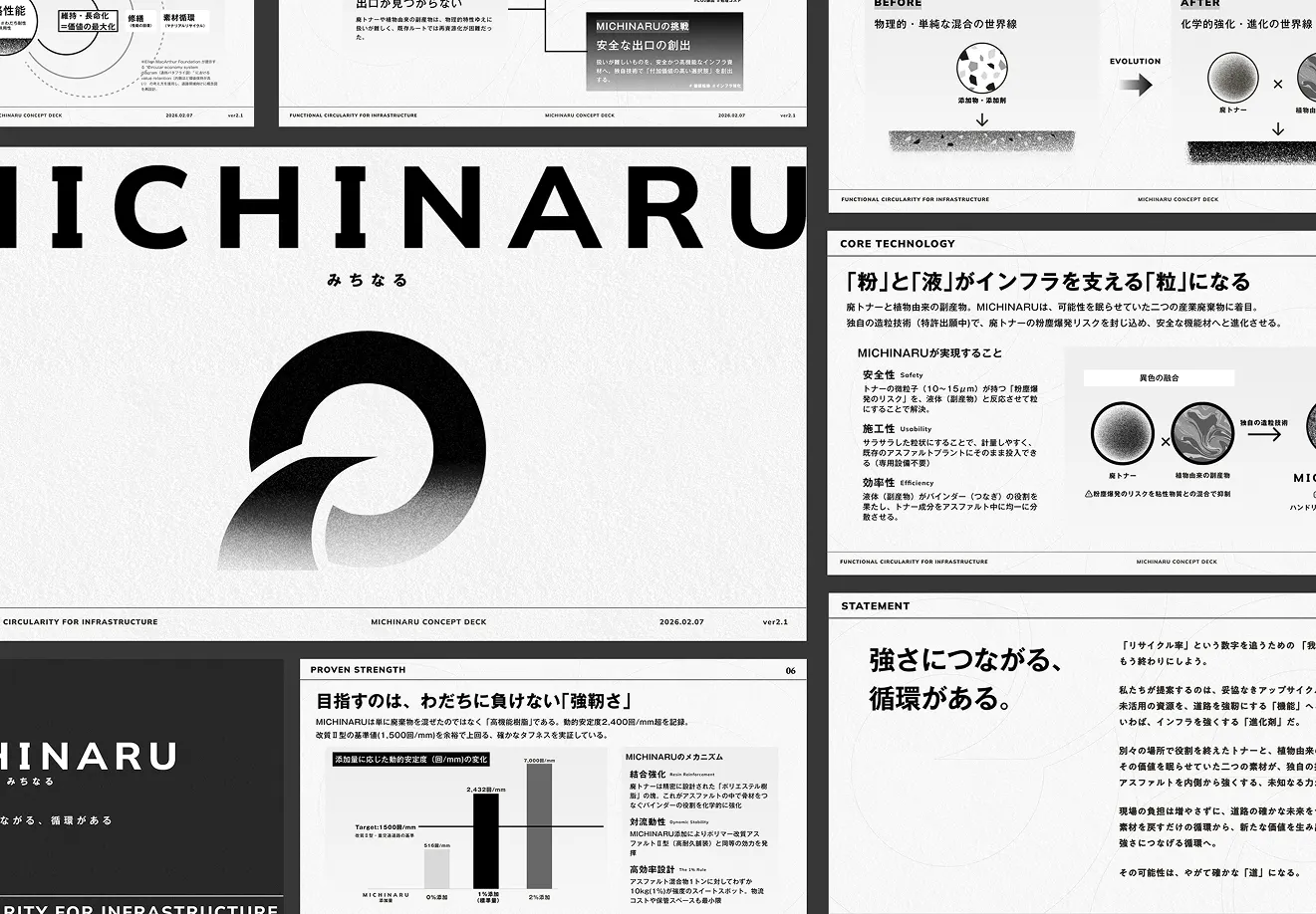 使用済みトナーと植物由来副産物から生まれる材料を、既存の「再生材」「添加剤」の枠ではなく、「進化剤」という新しいカテゴリとして再定義。再生材率から道路寿命へ、評価軸そのものを書き換えるブランド設計に、コンセプトからCI/BI、エコシステムの可視化までを一貫で担った。