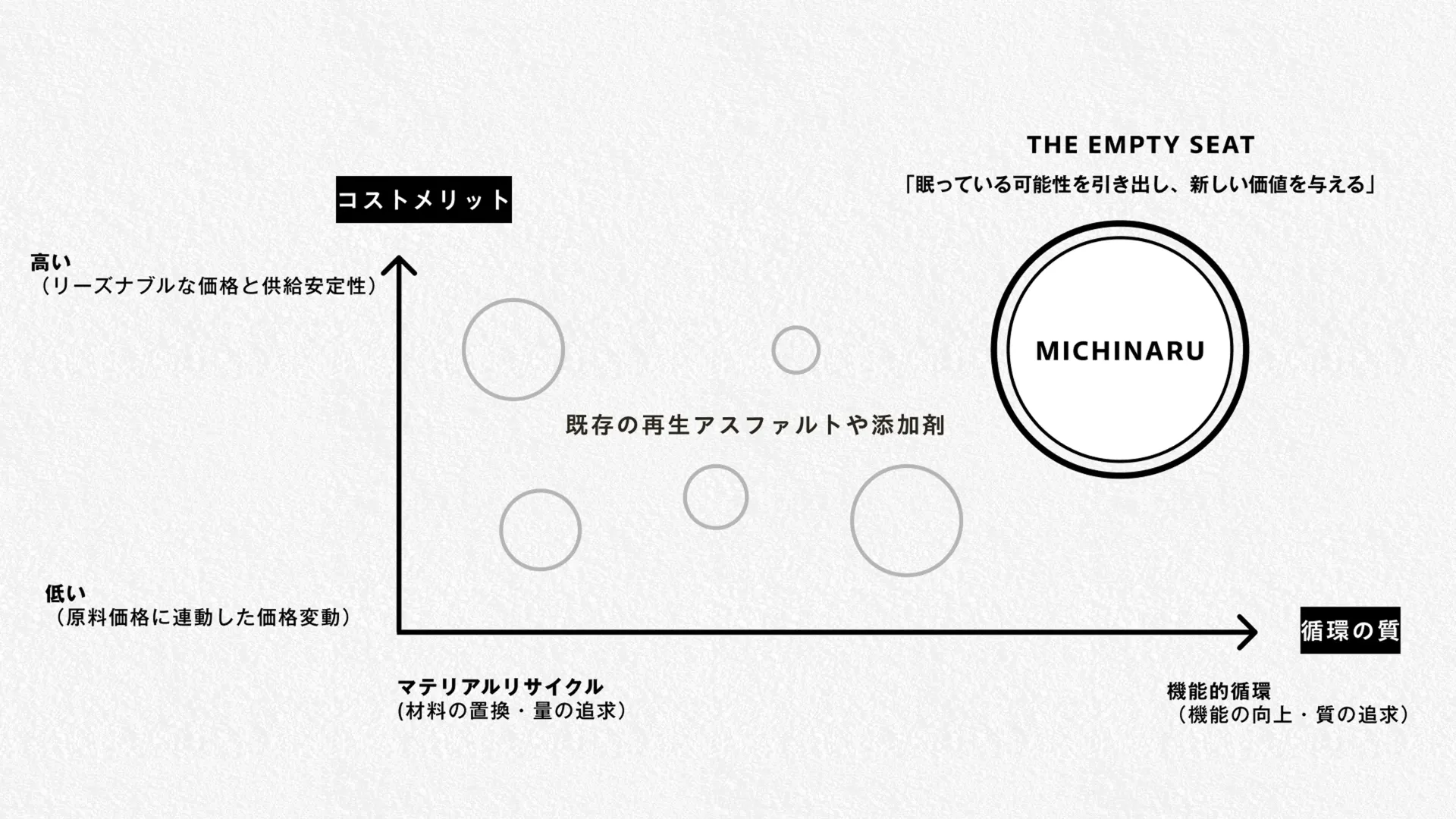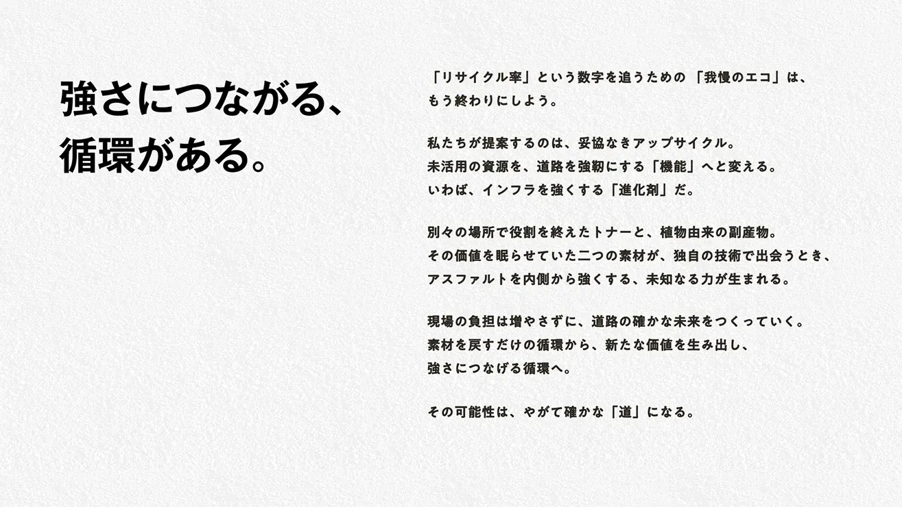 再生材率(Input)競争から、道路の機能向上・寿命(Output)競争へ、戦う土俵を移す。この発想を起点に、商品を「添加剤」ではなく「進化剤」として再定義しました。廃棄物由来であることの社会的必然性と、インフラの強度を高めるという機能性のどちらも語れるコンセプトを組み立てています。