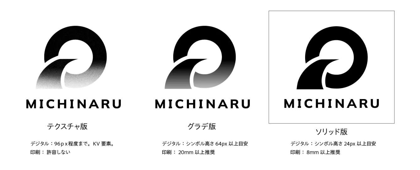 シンボルには「道」と「循環」を重ね合わせ、物理的な道路と、価値を循環させる軌道の両方を同時に示しています。「未知なる」という名前のとおり、まだ言語化されていない新しい材料カテゴリを、ひとつの記号として定義する意図を込めました。装飾を削ぎ落としたソリッドな黒のフォルムは、インフラを支える材料としての「強さ」を示唆するもの。土木・道路という重量のある領域に置かれる前提で、記号としての硬さを優先しています。