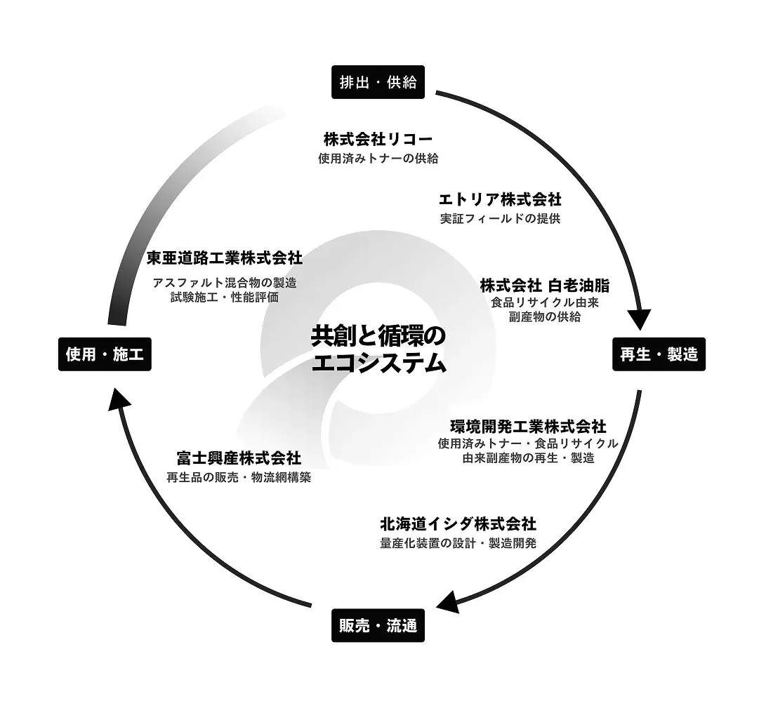 使用済みトナーと植物由来の副産物を、独自の造粒技術でアスファルト向けの機能材へと変える。
