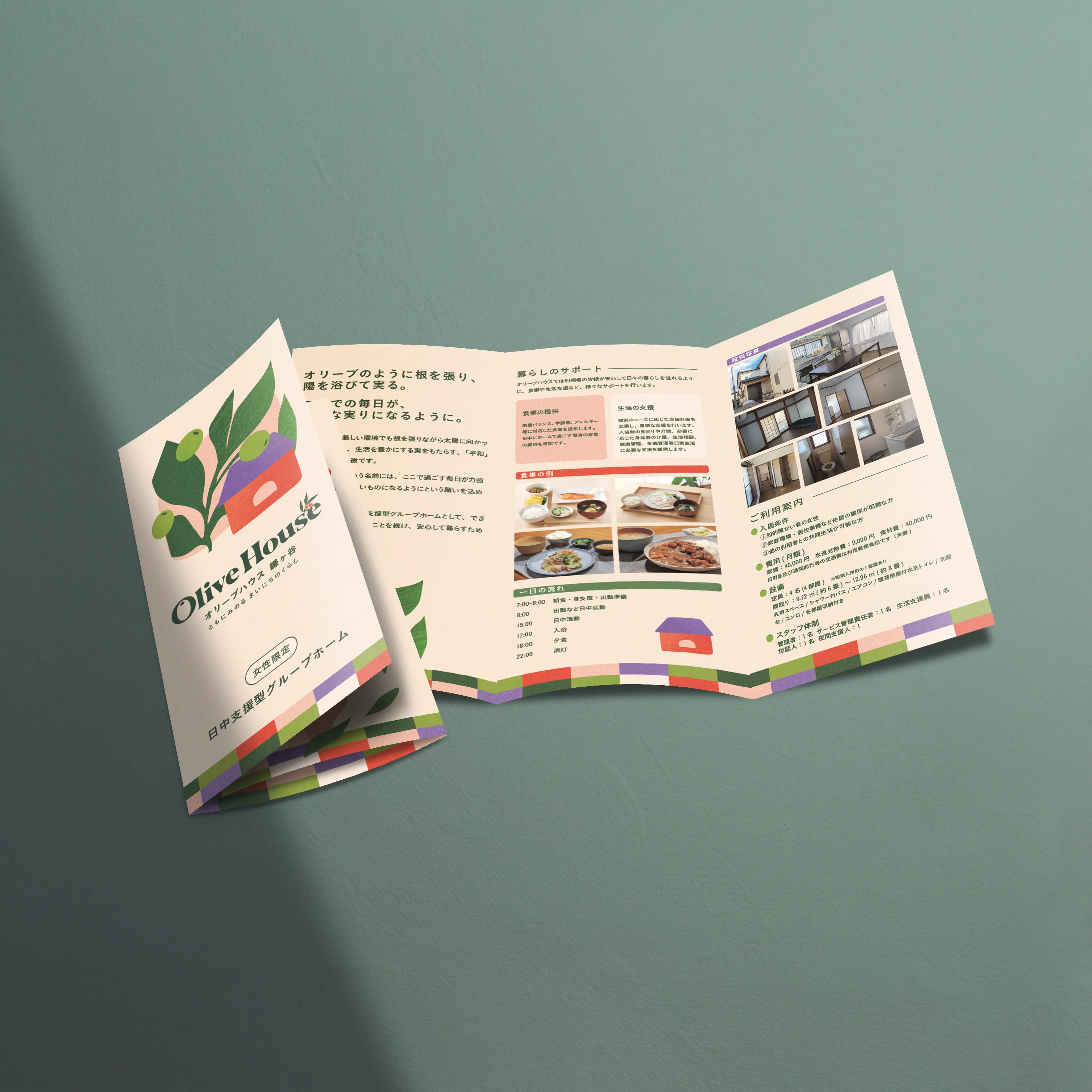 コンセプトをロゴ・カラーパレット・イラストレーション・パンフレット・名刺に展開。カラーパレットは8色、オリーブグリーンを軸にパープル・朱赤・ピンクを加え、暮らしの多様性を表現しました。名刺はフォントサイズを通常より大きくしたユニバーサルデザイン。手に取る人——家族、ケースワーカー、医療連携先——を想定しています。